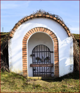 Die alte Kapelle aus dem 19./20. Jahrhundert ist zum größeren Teil in die Böschung hineingebaut – die ursprüngliche Giebelfassade