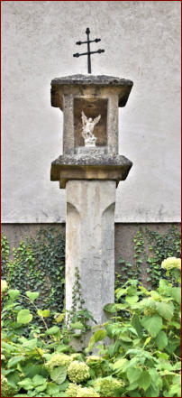 Teile mit neuen Teilen ergänzen und den Bildstock vor dem Pfarrhof aufstellen. In der Nische steht seit einigen Jahren eine Figur